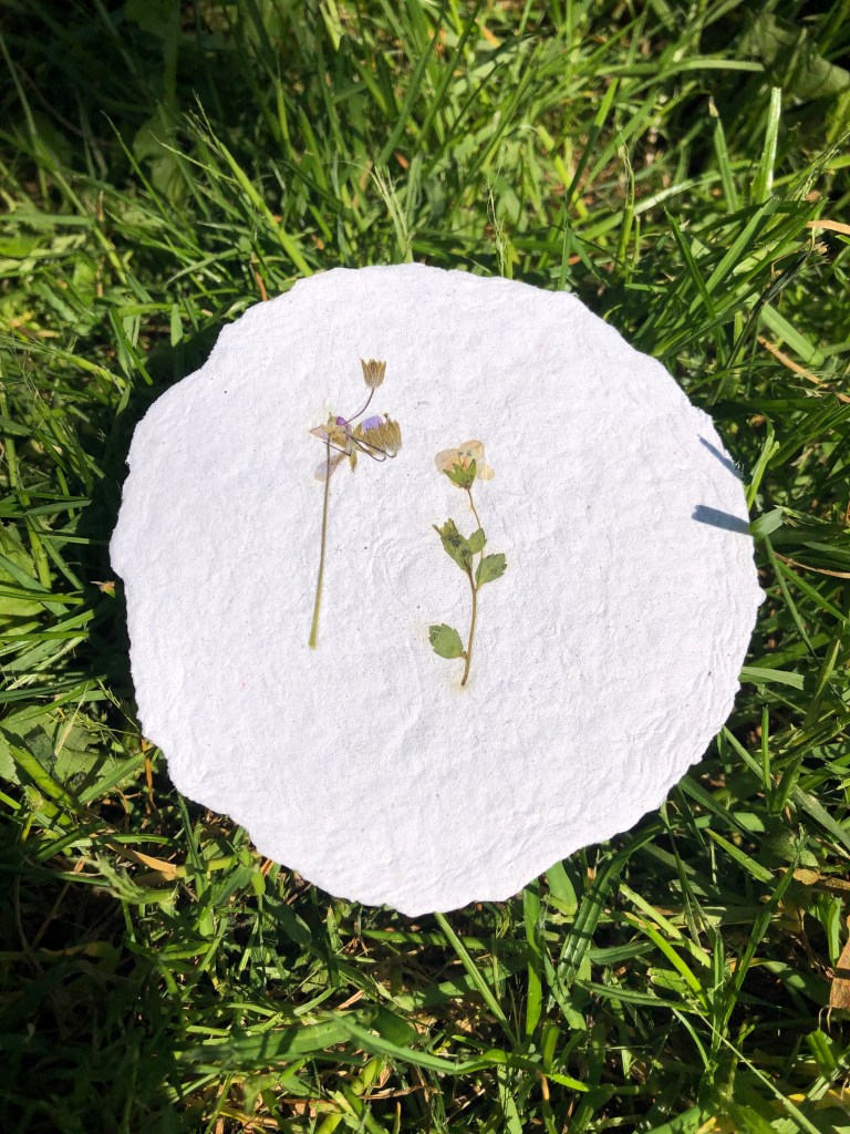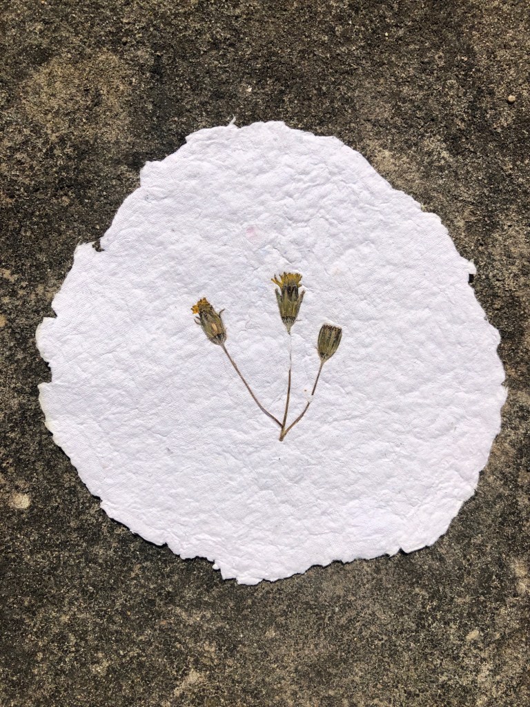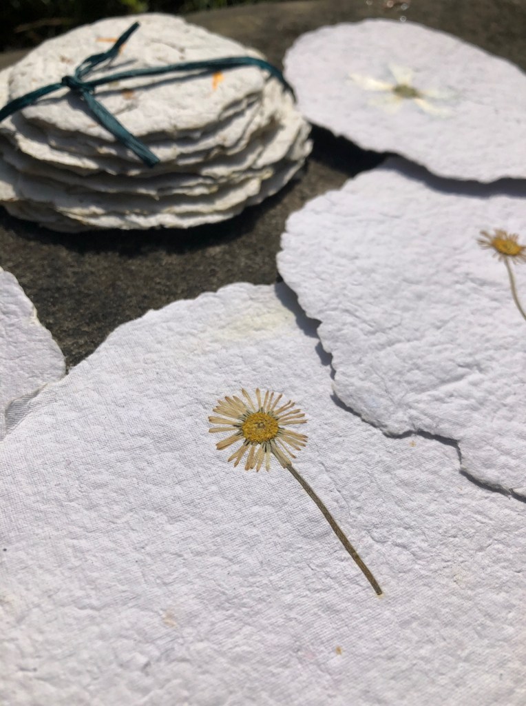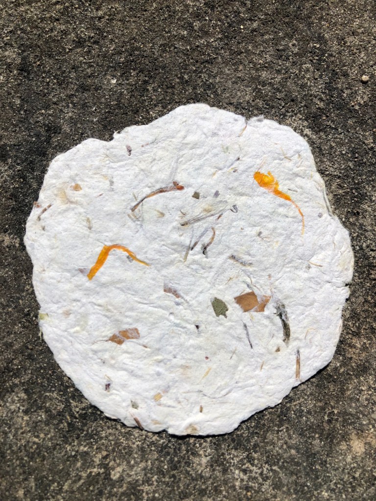 Papier artisanal, fabriqué à partir de matières recyclées avec inclusion de végétaux.