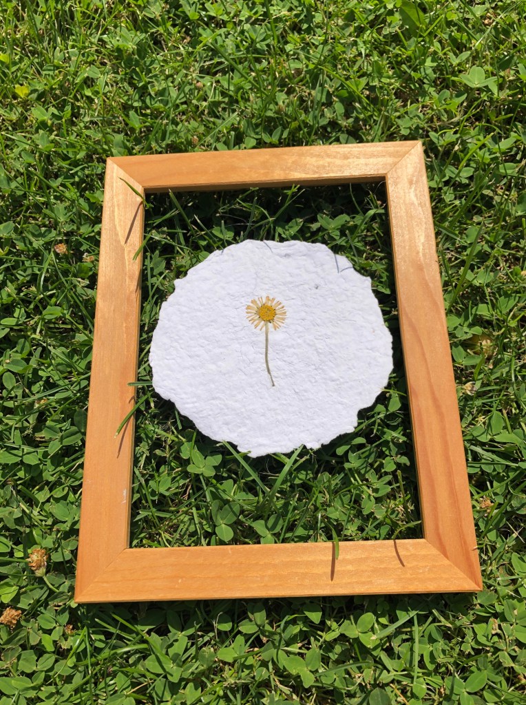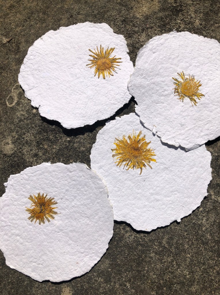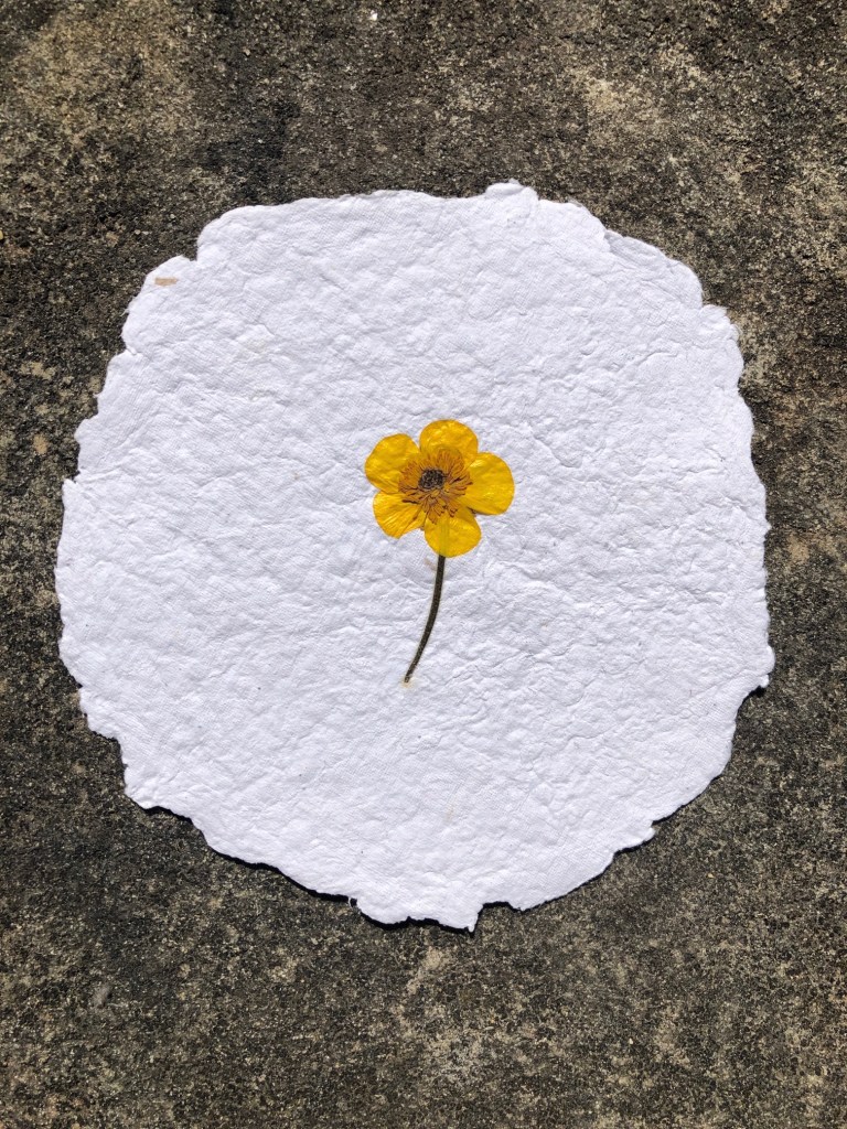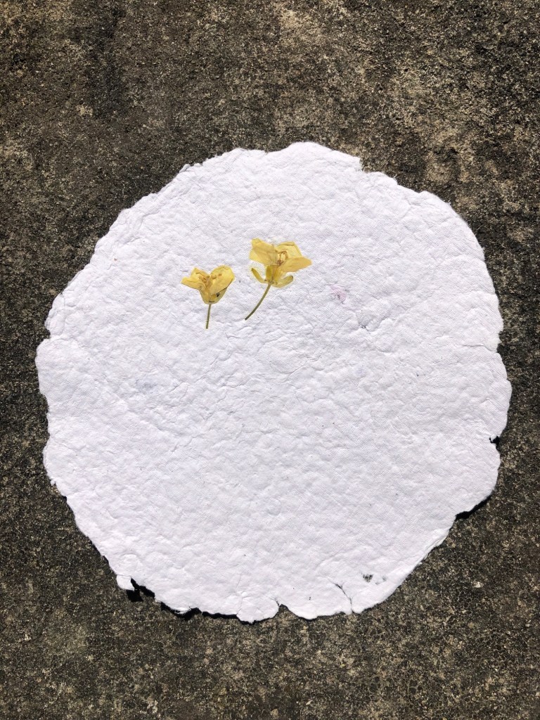 Papier artisanal, fabriqué à partir de matières recyclées avec inclusion de végétaux.